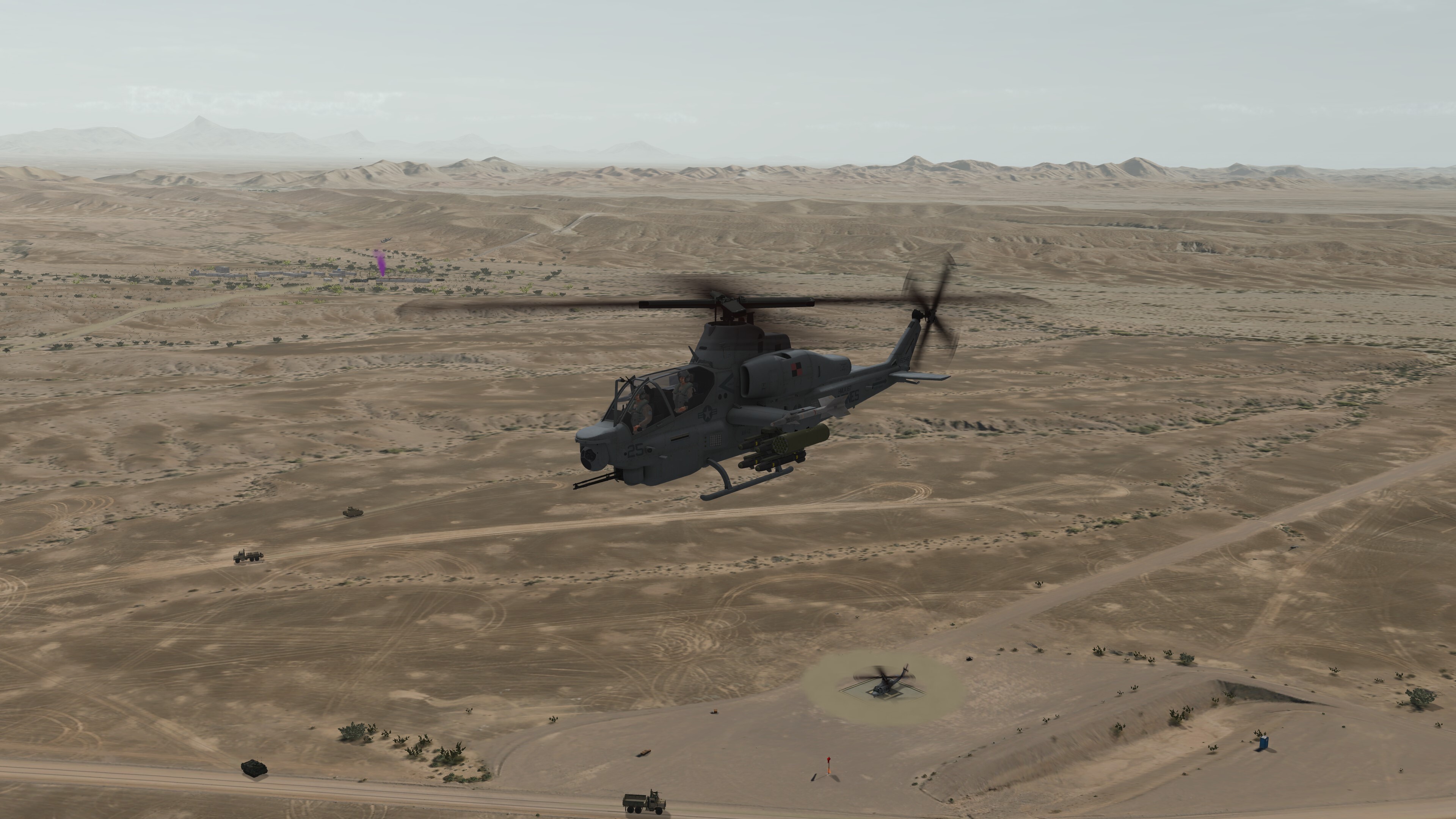 VRSG real-time scene of an AH-1Z entity from MVRsimulation's 3D model libraries in flight over geospecific virtual terrain of Yuma Proving Ground.
