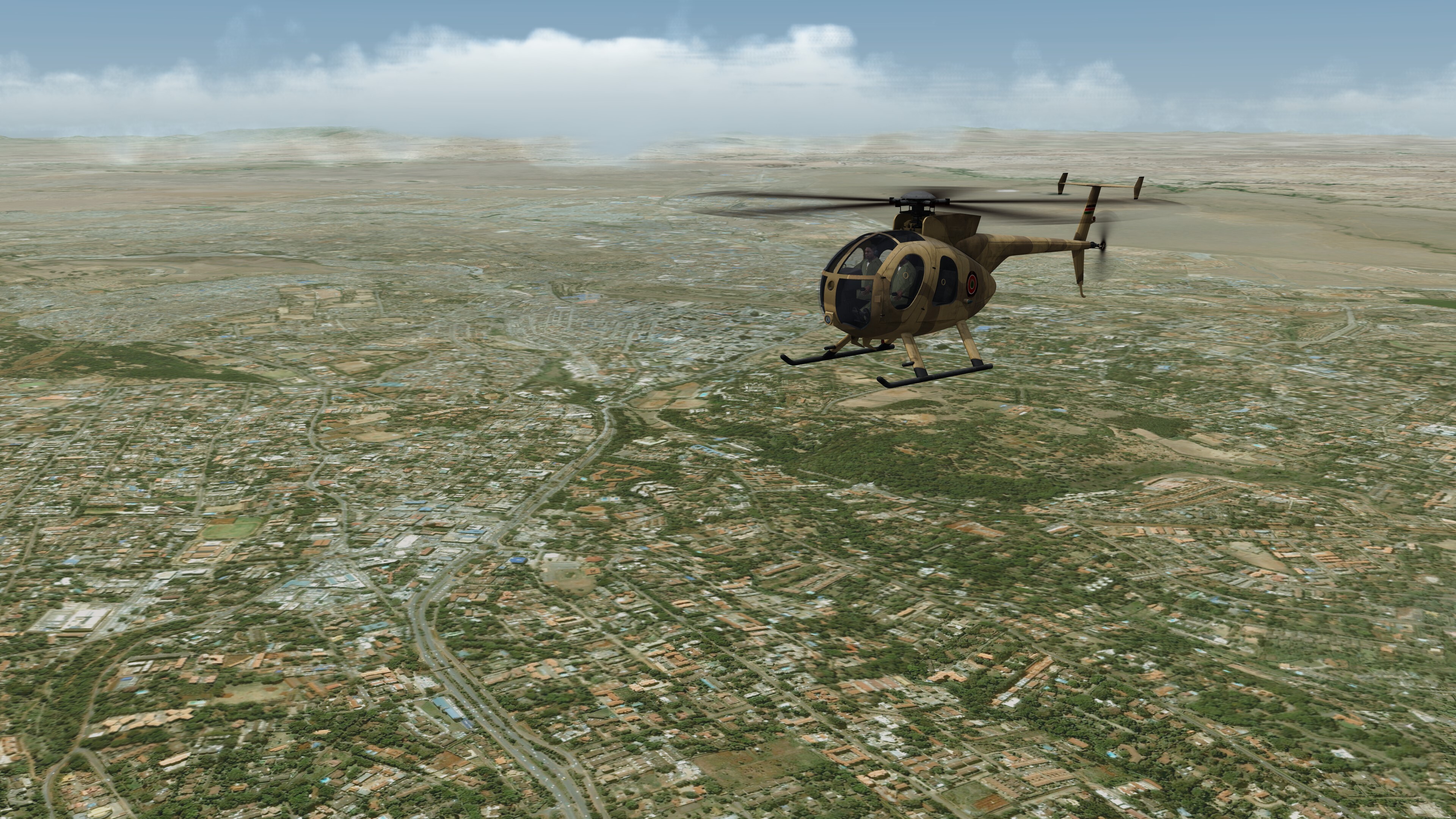 MVRsimulation VRSG real-time scene of an MD-500D entity over virtual Nairobi.