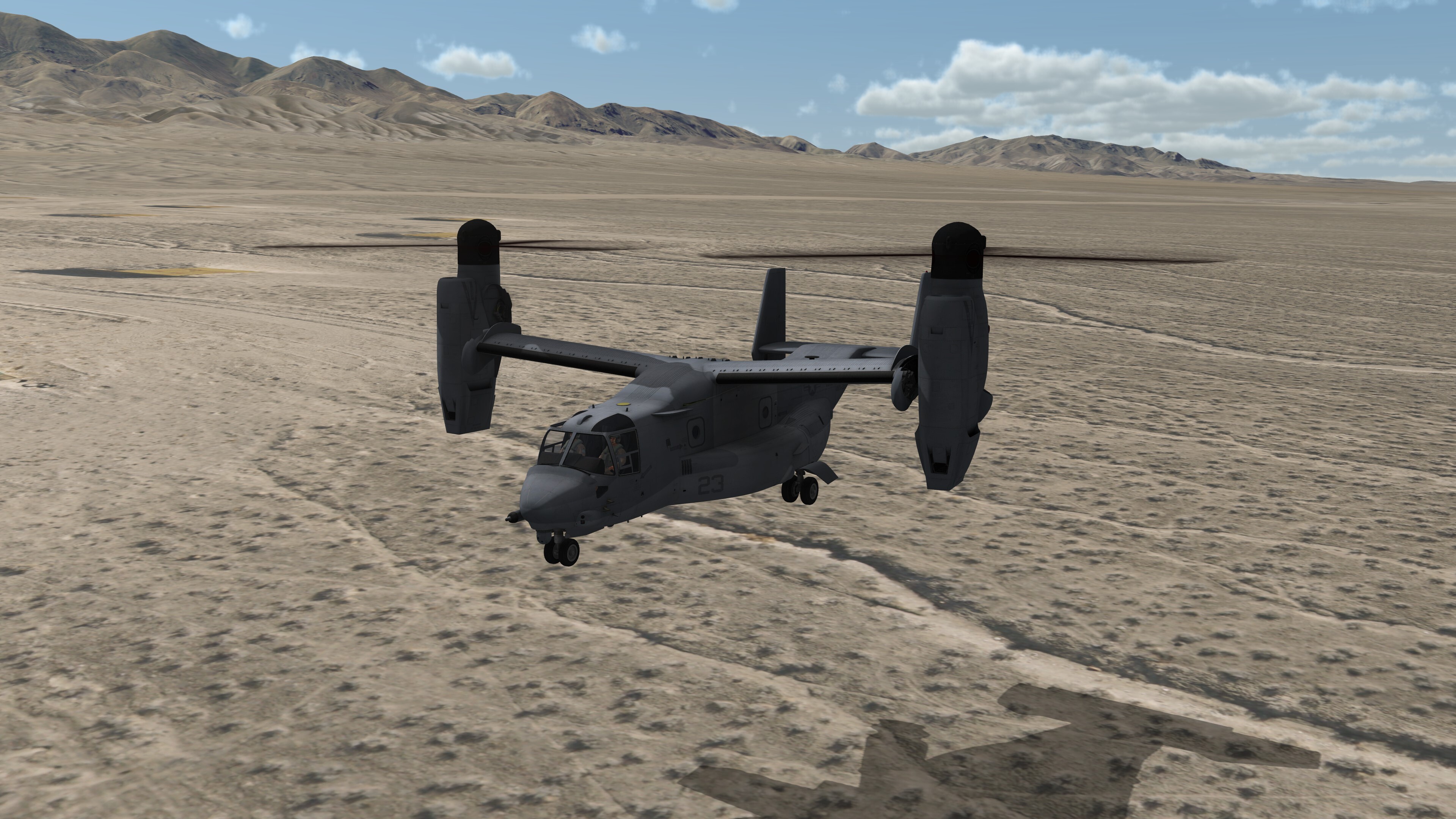 VRSG real-time scene of an MV-22 entity from MVRsimulation's 3D model libraries lifting off from geospecific 2 cm per-pixel resolution 3D terrain of the NAS Fallon Range Training Complex.