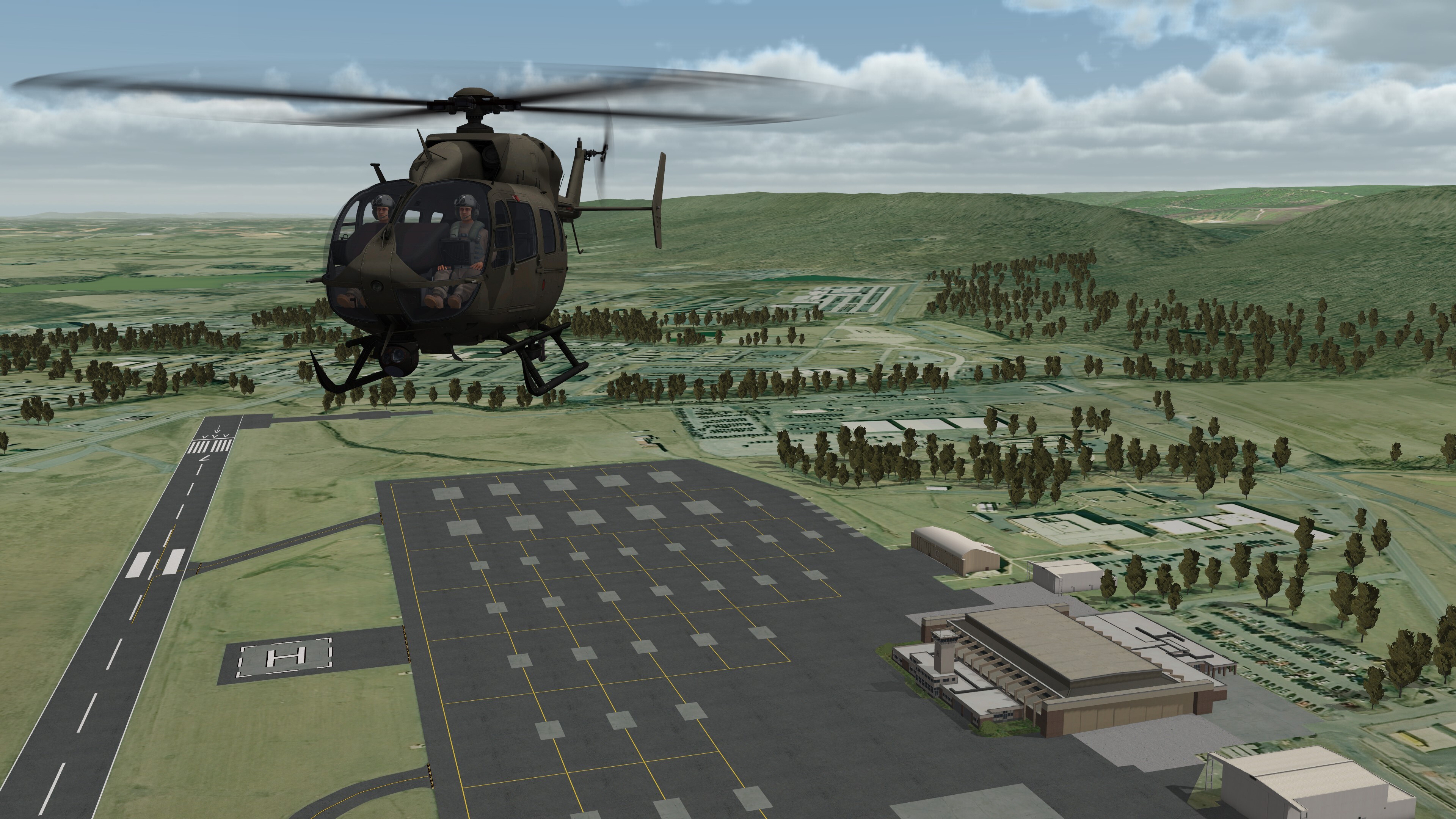 MVRsimulation VRSG real-time scene of a UH-72A MEP entity in flight over virtual Muir Army Airfield.