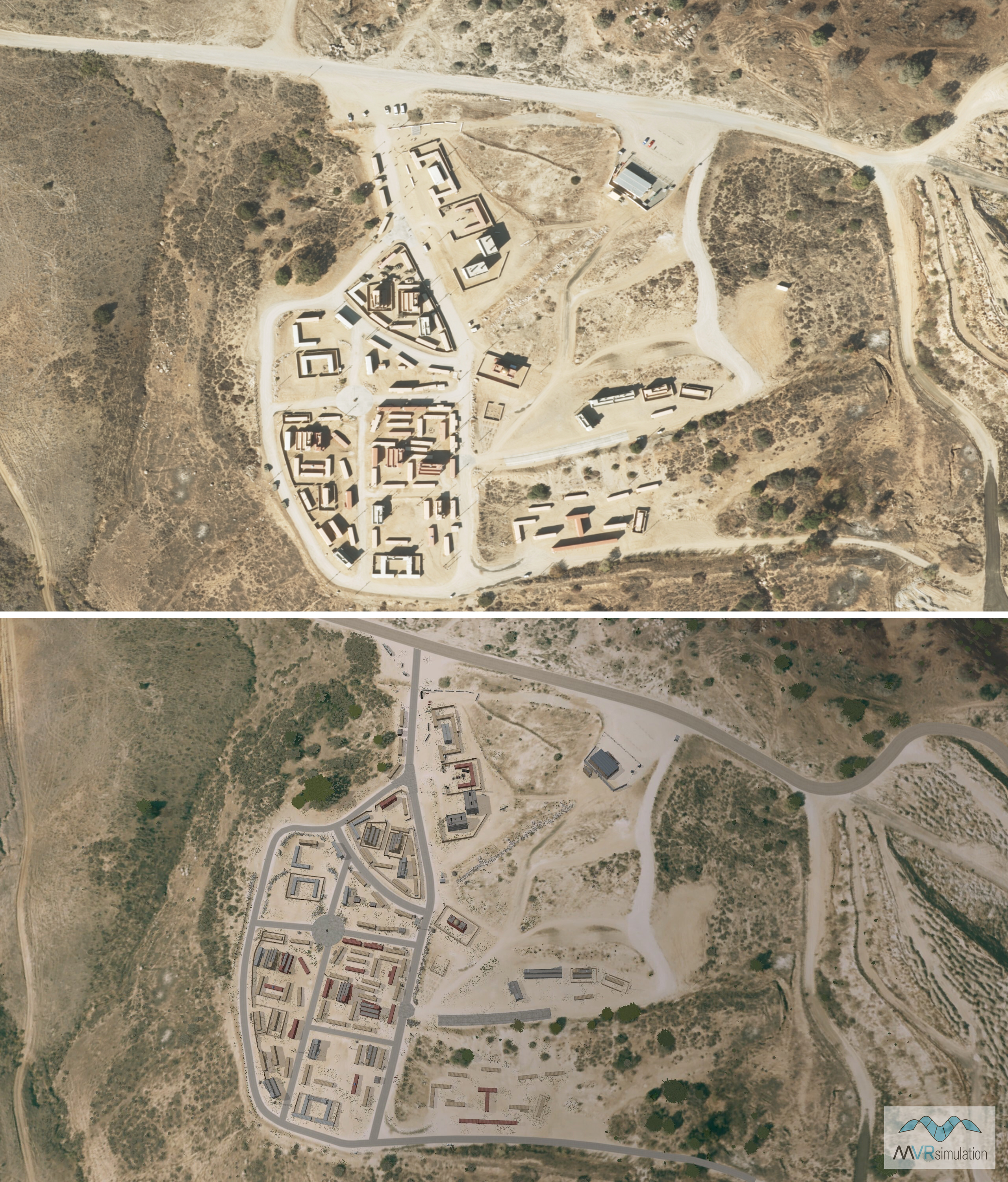 VRSG’s geospecific terrain database simulates real-world locations to facilitate training. Top: aerial photo; below: VRSG.