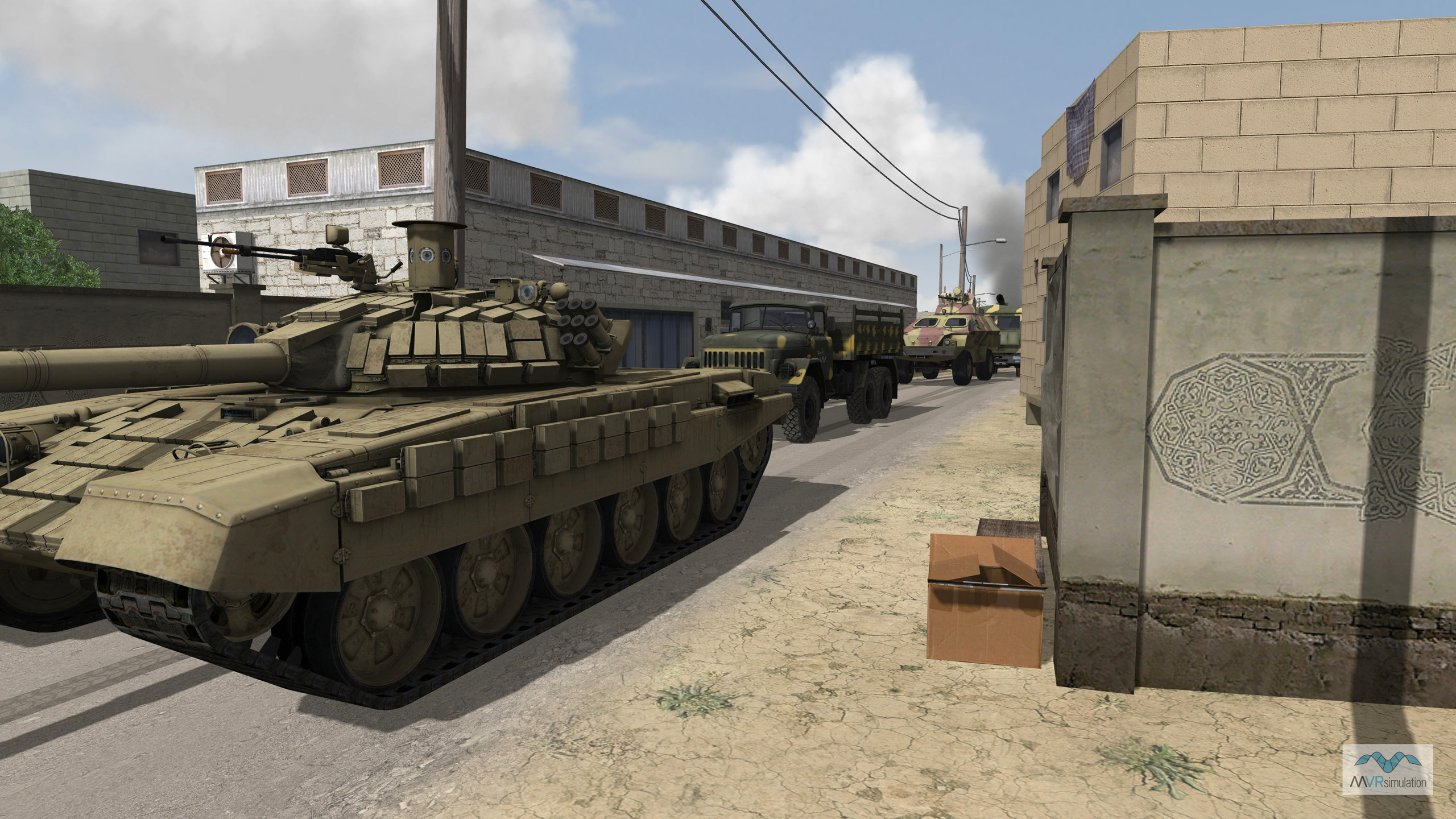 MVRsimulation VRSG real-time scene featuring a convoy travelling on the 3D virtual terrain of Hajin, Syria.