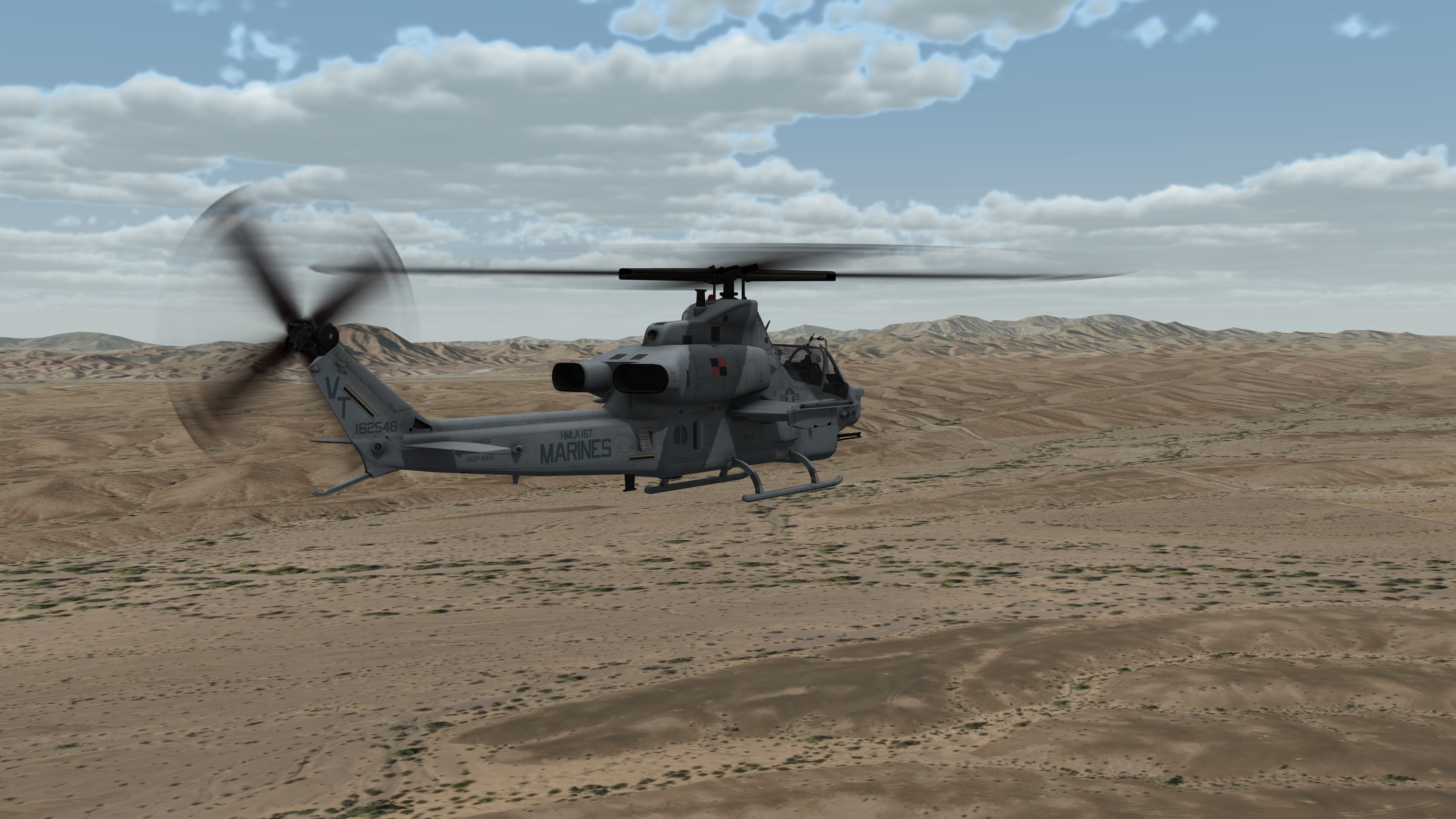 VRSG real-time scene of an AH-1Z entity from MVRsimulation's 3D model libraries in flight over geospecific virtual terrain of Yuma Proving Ground.