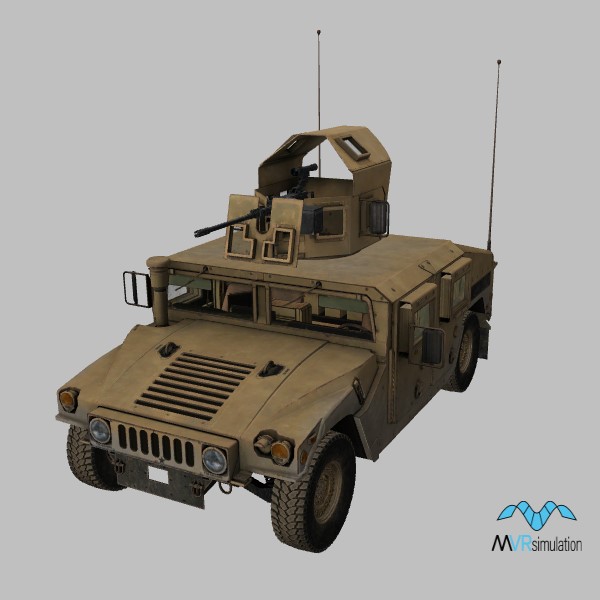 MVRsimulation's M1151 Iraqi humvee model is comprised of 28,740 triangles and 58 MB of textures (per paint scheme). MVRsimulation's 3D Content Military Entity library also has models of US and Afghanistan versions of the M1151. This model, available in camo and green paint schemes, features standard switch states for headlights, tail lights, and damage state and a flag that unfurls. In addition to the standard articulated doors and wheels, the turret, hatch, and gun mounts are articulated.