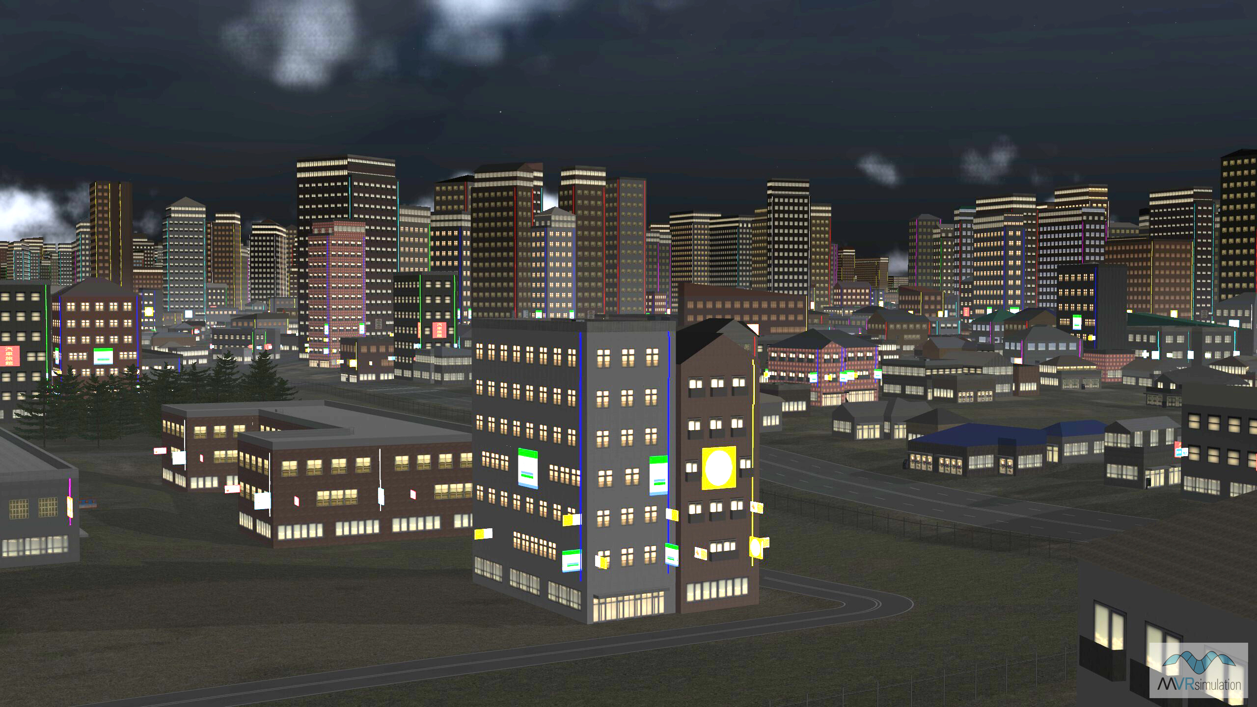 Real-time VRSG scene with light lobes and building lighting including neon lights from commercial signage.
